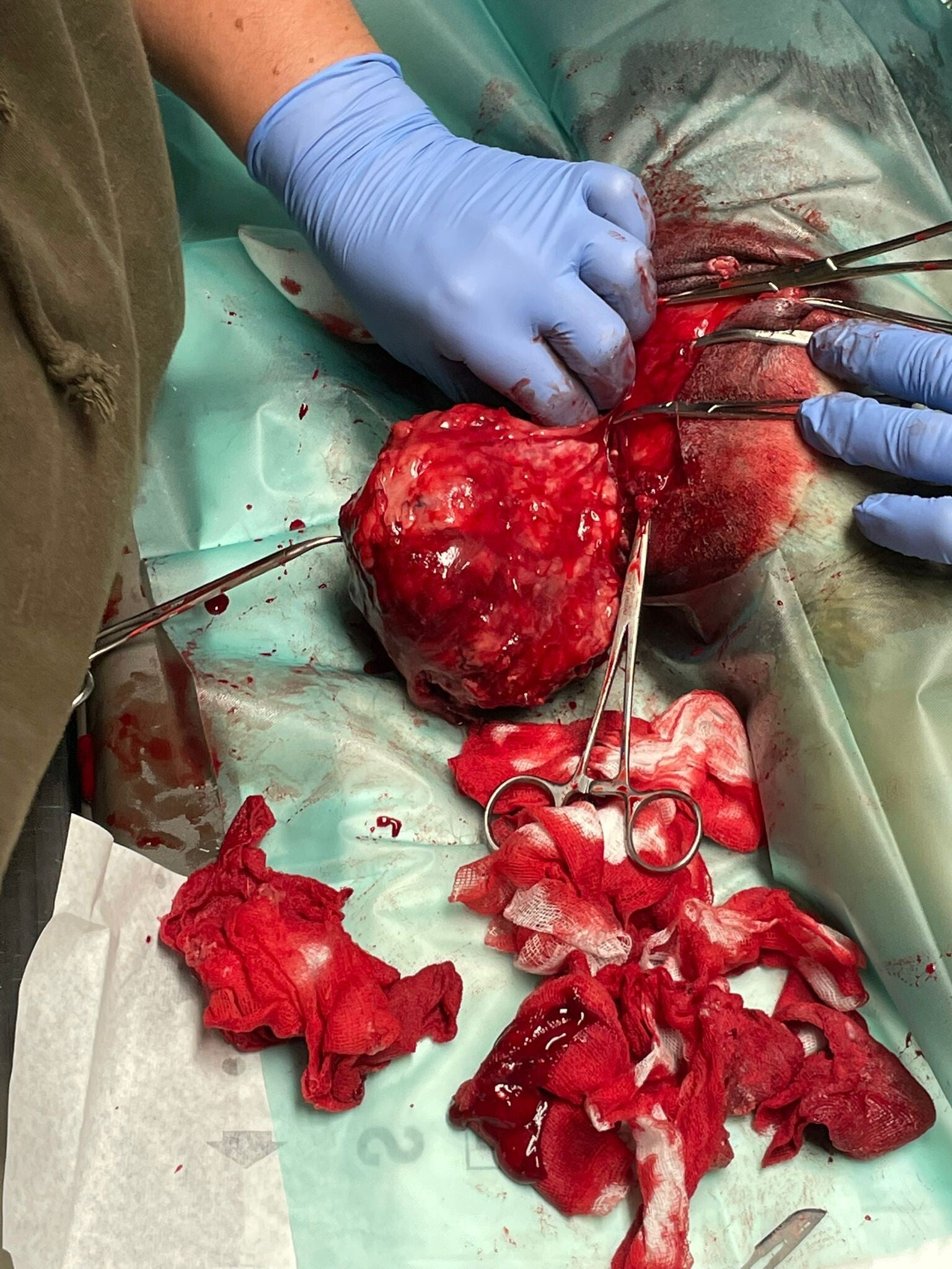De bult is begonnen als een klein vetbultje. Echter groeide de bult steeds sneller. Uiteindelijk toch besloten om hem weg te halen. Bijgaand wat foto's van de bult. We hebben hem nog even gewogen, 360 gram.